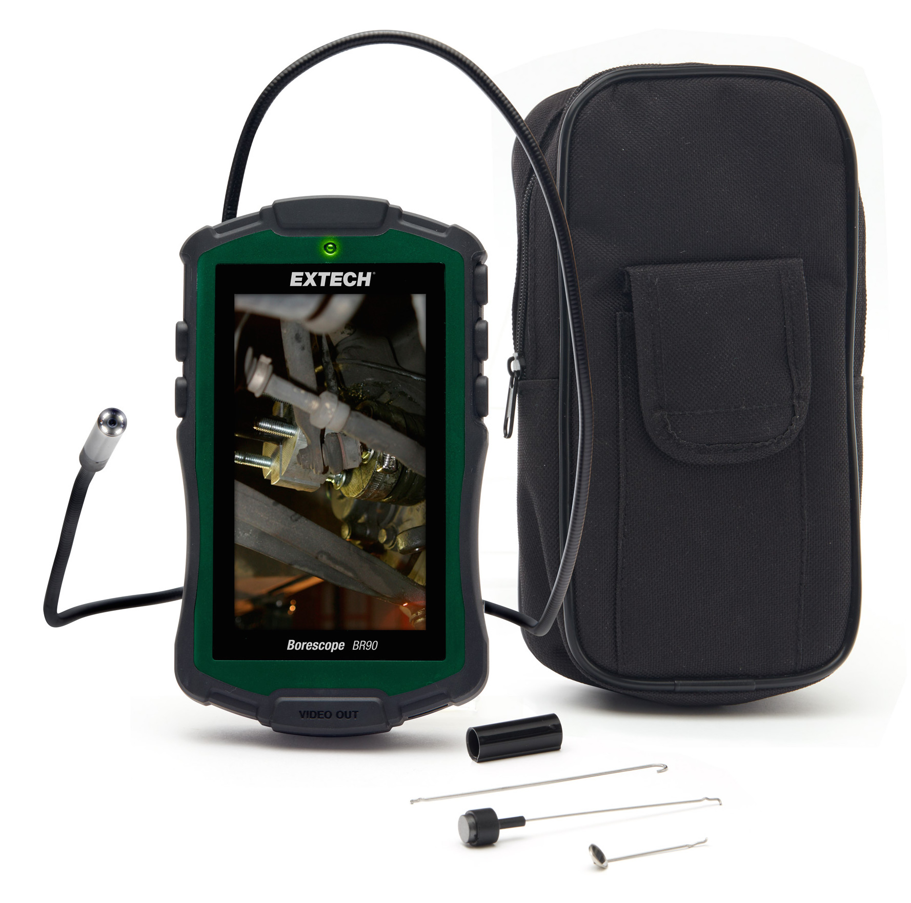 A palm-sized, waterproof (IP67) 8 mm camera probe with a 2.5' flexible goose-neck cable to retain its configured shape. Features a 640 x 480 pixel resolution, 2x digital zoom, and built-in bright LED lamps to help project viewed objects clearly on the large 4.3" color LCD display.