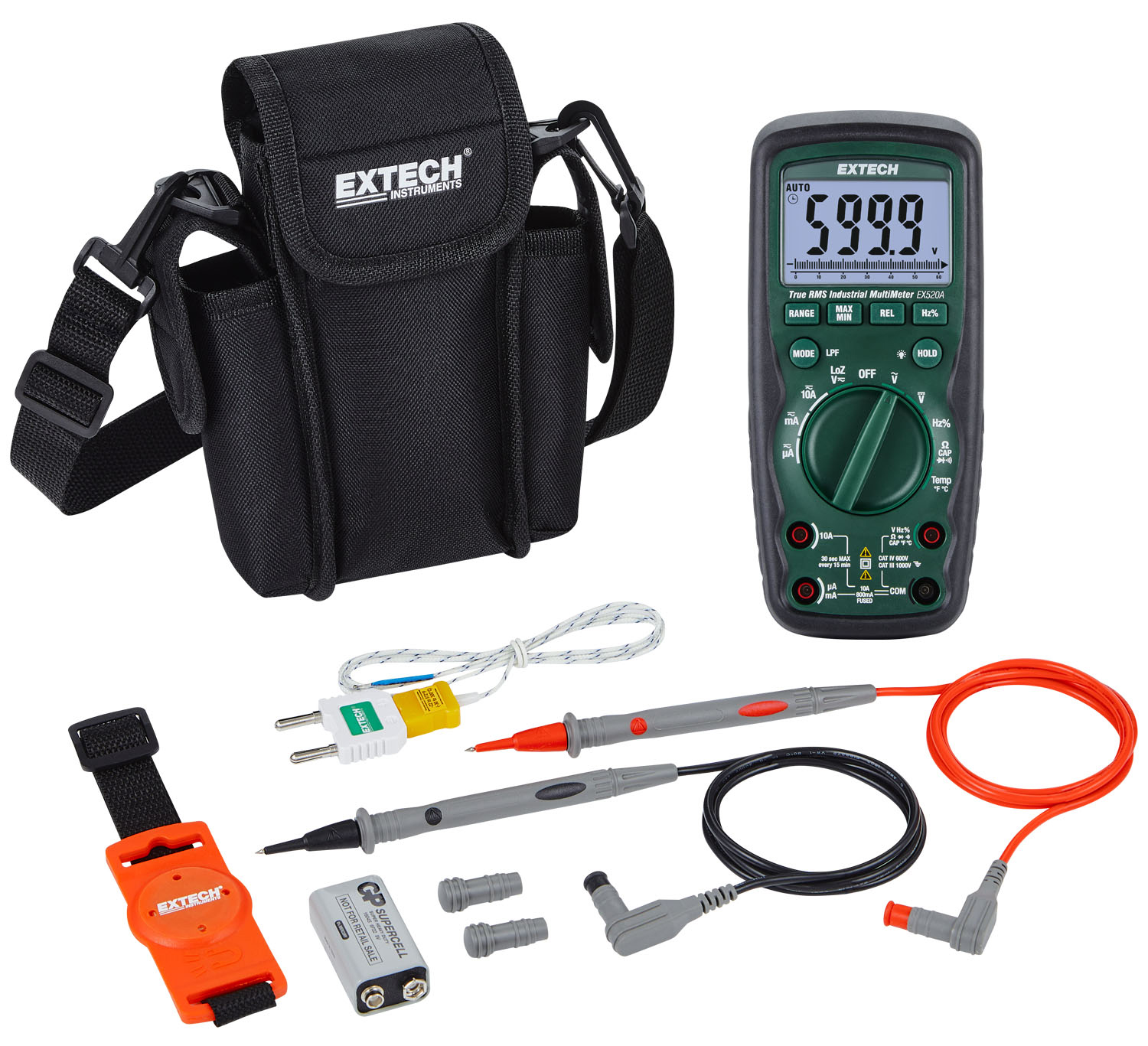All models in the EX5xxA Series come with double-molded test leads, a 9 V battery, a magnetic hanging strap, a temperature probe, a carrying case, and a three-year warranty. They are designed for electricians, HVAC/R technicians, and benchtop technicians who require accuracy, durability, and safety in their electrical testing equipment.