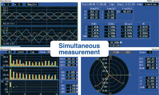 The PQ3100 records data including voltage, current, power, harmonics, and flicker* simultaneously along a single time axis, and the included PQ ONE application software makes it easy to create reports.