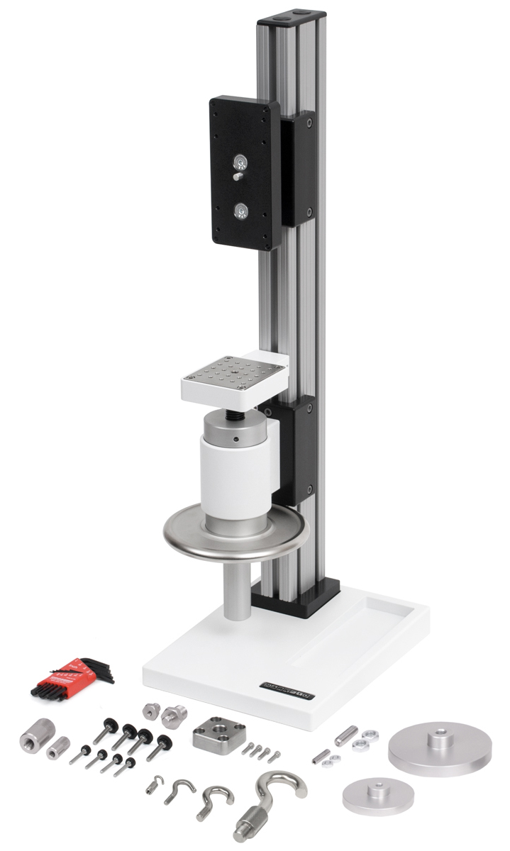Ruggedly built for testing up to 1000 lbF (5 kN) of compression or tension force, this vertical test stand is ideal for laboratory and industrial environments. Features a large hand wheel that requires little effort, even at high loads, and a precision Acme screw and nut ensure smooth operation over time.