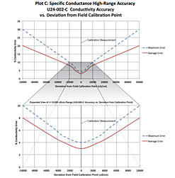High range | 5% of reading, in waters within a range of ±3,000 µS/cm; waters with greater variation can have substantially greater error (see Plot C) |