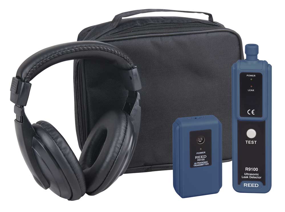 This ultrasonic leak detector converts ultrasound signals produced by industrial machinery into easily recognizable audible sounds for a user to evaluate the condition of individual components. The R9100 includes a transmitter that generates a 40 kHz signal to help pinpoint leaks and headphones for use in loud environments.