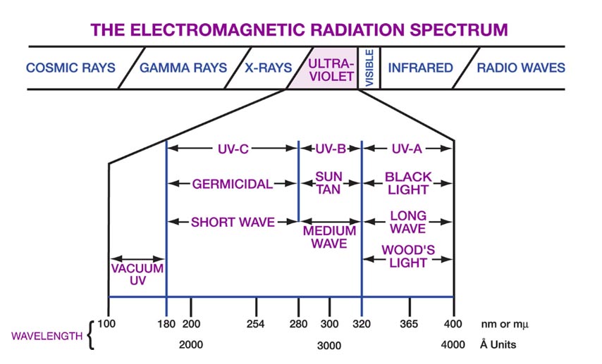 Ultraviolet light is a natural part of our environment, most commonly found in sunlight. It is an invisible band of electromagnetic radiation just beyond the violet end of the visible spectrum. This band is generally divided into short,medium and long wavelength regions that differ in their effects on the human body.