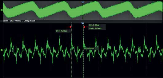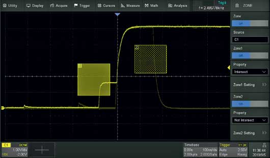The record length of up to 250 Mpts (interleaved) or up to 125 Mpts (non-interleaved) allows use of a higher sampling rate to capture more signal detail. The hardware-based Zoom then allows quick zoom in to any area of interest.