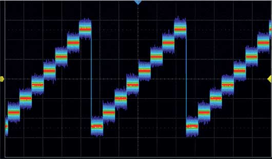 256-level intensity graded waveform display is ideal for viewing modulated and changing waveforms.The Color temperature display clearly shows noise and jitter with infrequently occurring waveforms shown in blue through to the most frequently occurring waveforms shown in red.