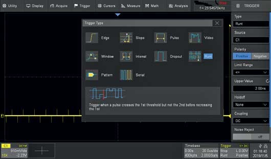 | Trigger Type | Edge, Slope, Pulse width, Window, Runt, Interval, Dropout, Pattern, Video, Qualified, Serial |